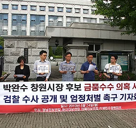 경남진보연합 썸네일형 리스트형 박완수 후보 금품수수 의혹 수사결과 공개 촉구 통합 창원시장으로 출마중인 한나라당 박완수 후보의 금품수수 의혹사건에 대해 시민단체가 수사결과를 조속히 공개하고 엄정처벌을 검찰에 촉구했다. 경남진보연합과 마산진보연합, 진해진보연합, 민생민주창원회의는 24일 경남지방검찰청 앞에서 가진 기자회견을 통해 “선거과정을 통해서 창원시민들에게 올바른 정보를 제공하고 이를 통해 시민들이 올바른 판단을 받아야 한다”며 이와 같이 촉구했다. 한나라당 박완수 후보는 창원시장 선거에 무소속으로 출마한 당시인 2002년 4월께 창원 재건축조합장으로부터 5000만원을 받은 의혹을 받고 있다. 이와 같은 사실은 한 모 재건축조합장이 5000만원을 돌려달라는 소송을 내고 기자회견을 열면서 알려졌다. 지난 7일 박완수 후보의 금품수수 의혹에 대해 검찰의 엄정수사를 촉구한 바 있는.. 더보기 이전 1 다음