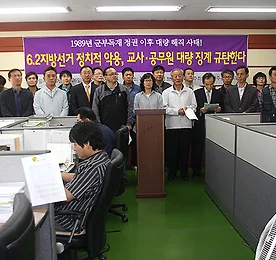 전교조 탄압 썸네일형 리스트형 2만원 후원 교사 파면, 수백만원 정치자금은 무죄 현 정부가 민주노동당에 가입한 협의로 현직 공립교사 134명과 지방공무원 83명 등 모두 217명을 중징계하기로 23일 결정한데 대해 경남 시민사회단체가 반발하고 있다. 민생민주경남회의는 26일 경남교육청에서 가진 기자회견을 통해 “이명박 정부는 교사, 공무원 대량학살을 즉각 중단하라”고 요구했다. 이 단체는 “여기에 더해 사립학교 교사 35명도 학교 재단이사장에게 파면 해임을 요구할 계획이어서 쫓겨나는 교사가 모두 169명에 이르게 되었다”고 덧붙였다. 민생민주경남회의는 “(이 같은)정부의 조치는 군사독재정권 이후 교사와 공무원에 대한 최대의 대량학살이며 공정성과 형평성도 없는 명백한 정치탄압”이라고 주장했다. 또, “아직 법원의 판결이 나오지 않은 상황에서 혐의만 가지고 일방적인 징계를 추진하는 것은.. 더보기 이전 1 다음
