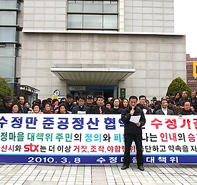 STX 썸네일형 리스트형 수정주민들, 협약안 수정가결에 함박미소 “지난 3년 동안 온갖 회유와 협박에도 굴하지 않고 서로를 격려하며 동고동락을 함께 해 온 우리 수정주민들이 자랑스럽습니다.” stx 조선기자재 공장유치를 반대해 온 수정마을 주민들이 오랜만에 밝은 미소를 지었다. 마산시의회가 ‘수정지구 공유수면 매립사업 준공정산 협약 동의안’(이하 준공정산 협약동의안)에 대해 이주보상 문제 등을 삭제한 채 가결했기 때문이다. 마산시 의회는 8일 169회 3차 본회의를 통해 마산시가 제출한 ‘준공정산 협약동의안’에 대해 협약안의 제7조(민원조정위원회 운영조항)와 제8조(이주보상과 관련한 협의) 조항을 삭제한 채 가결했다. 이로서 stx중공업은 수정마을 공유수면 매립지에 대한 소유권을 마산시로부터 넘겨받게 되었지만, 보상 문제를 포함한 민원을 먼저 해결해야 하는 의무를 떠.. 더보기 STX와 마산시, 화장실 갈 때와 나올 때는 다르다? 수정주민들, “STX조선소 건설은 사기극” 마산시의회 심의 앞둔 상태....보상문제로 찬성주민들조차 반발 마산시 ‘수정지구 공유수면 매립사업 준공정산 협약안’의 마산시의회 심의를 앞두고 찬반 양측 주민들의 반발이 강하게 일고 있다. 현재 3년 넘게 끌어 온 수정만 STX 조선기자재 공장건설은 대부분의 법적인 행정절차를 거의 마친 상태로, 마산시의회의 동의를 거치면 수정만 매립지의 소유권은 마산시에서 STX로 이전된다. 지난 1월19일 ‘수정지구 공유수면 매립사업 준공정산 협약안’에 대해 보류를 해놓고 있는 마산시의회 건설도시상임위원회는, 2월말과 3월초에 열리는 회기에서 협약안을 다시 심의 한다는 입장이다. 이와관련해 그동안 조선기자재 건설을 반대하고 있는 ‘수정마을 STX 주민대책위원회’는 17일 마산.. 더보기 남해안 수정마을, 성장논리의 제물이 되나? 수정마을은 마산시 구산면에 위치하고 있다. 조선시대부터 마을이 형성되기 시작한 남해안 수정마을은 수정만을 끼고 있는 작은 어촌마을이기도 하다. 이 조용한 어촌마을에 마산시가 STX조선소를 유치하려 하면서 마창진 환경운동연합, 트라피스트 수녀원과 주민들의 반대에 부딪치고 있다. 수정마을 주민들의 갈등은 개발로 인한 이익을 바라는 사람과 그곳에 남고 싶은 사람과의 갈등이기도 하다. 마산시는 조선소 유치를 위해 「2020마산도시기본계획」에 수정지구 매립지와 그 일대를 공업지역으로 바꾸어 놓았다. 이후에 찬성하는 주민들이 생겨나면서 주민들 간의 갈등과 폭력사건도 발생했다. 마산시가 주민들의 입장과는 상관없이 강행의사를 밝히면서 장혜경 트라피스트 수녀원장과 수녀 1인의 단식농성을 하기도 했다. 하지만 한일합섬 공.. 더보기 마산시 매립목적변경추진 발표에 반대주민 강력반발 마산시 매립목적변경추진 발표에 반대주민 강력반발 주민대책위 "찬반주민 서명날인명부 대조하자" 제안 마산시가 3일 수정 공유수면매립 목적변경절차를 추진하겠다는 발표를 하자 수정마을 대책위가 강력히 반발하고 있다. 수정마을 대책위는 주민동의 없는 매립목적변경은 시민사회와 종교계의 강력한 저항에 직면할 것이라고 경고하면서, 경상남도에 대해서도 “마산시의 수정지구 매립목적변경 강행에 절대 수긍해서는 안 된다.”고 강조했다. 현재 마산시청에는 수정지구 매립목적변경 반대하며 수정주민대책위원회 부위원장인 장혜경 수녀원장 외 수녀 1인이 시장실 앞 복도에서 단식 5일째를 맞이하고 있는 상황. 수정마을 대책위는 오늘 이루어진 마산시의 기자회견에 대해 지난 금요일 황 시장은 단식중인 장혜경 수녀원장과의 독대를 요청한 자리.. 더보기 수정마을 주민 폭행사건, 마산시의 정보 유출이 발단 수정마을 주민 폭행사건, 마산시의 정보 유출이 발단 마산시 관계자가 수정발전위에 녹취록 여과 없이 유출 마산 수정공유수면매립 목적변경과 관련해 주민대책위와 마산시의 갈등이 고조되고 있는 가운데 주민간의 갈등이 폭행사건으로 까지 확대되고 있다. 특히 이 폭행사건의 배경에는 마산시가 주민들의 갈등을 고려하지 않은 채, 무분별하게 정보를 노출하여 갈등을 조장한 측면이 있어 비난도 일 것으로 보인다. 폭행사건이 일어난 과정 폭행사건은 29일 반대측 주민들이 수정마을 회관에서 회의를 마치고 나오면서 발생한다. 현장을 목격한 주민에 의하면 29일 7시부터 마을회관에서 주민대책위의 회의가 열렸고, 약 8시경 회의를 마친 변갑숙(56세/여성)외 4인이 귀가하던 중, 마을 포장마차에서 있던 조선소 유치를 찬성하고 있는 .. 더보기 수정만 조선소 강행, 트라피스트 수녀원장 무기한 단식 수정만 조선소 강행, 트라피스트 수녀원장 무기한 단식 마산시 유치 입장에 갈등 고조...“시체가 되어나갈 때까지” STX 조선소 유치를 위한 마산시 수정지구 공유수면매립 목적변경을 두고 마산시와 반대 주민과의 갈등이 트라피스트 장혜경 수녀원장의 무기한 단식 농성으로 고조되고 있다. 27일 STX조선소 유치 반대를 위한 문화제와 촛불기도회를 가지면서 결국 철야농성을 전개하기도 했던 주민들과 트라피스트 수녀원, 마창진 환경운